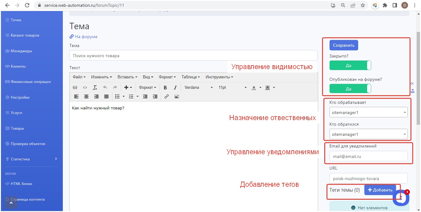 Управление темой позволяет настроить видимость, активировать тему, назначить ответствнного, добавить теги. Редактирование текста в стандартном редакторе.