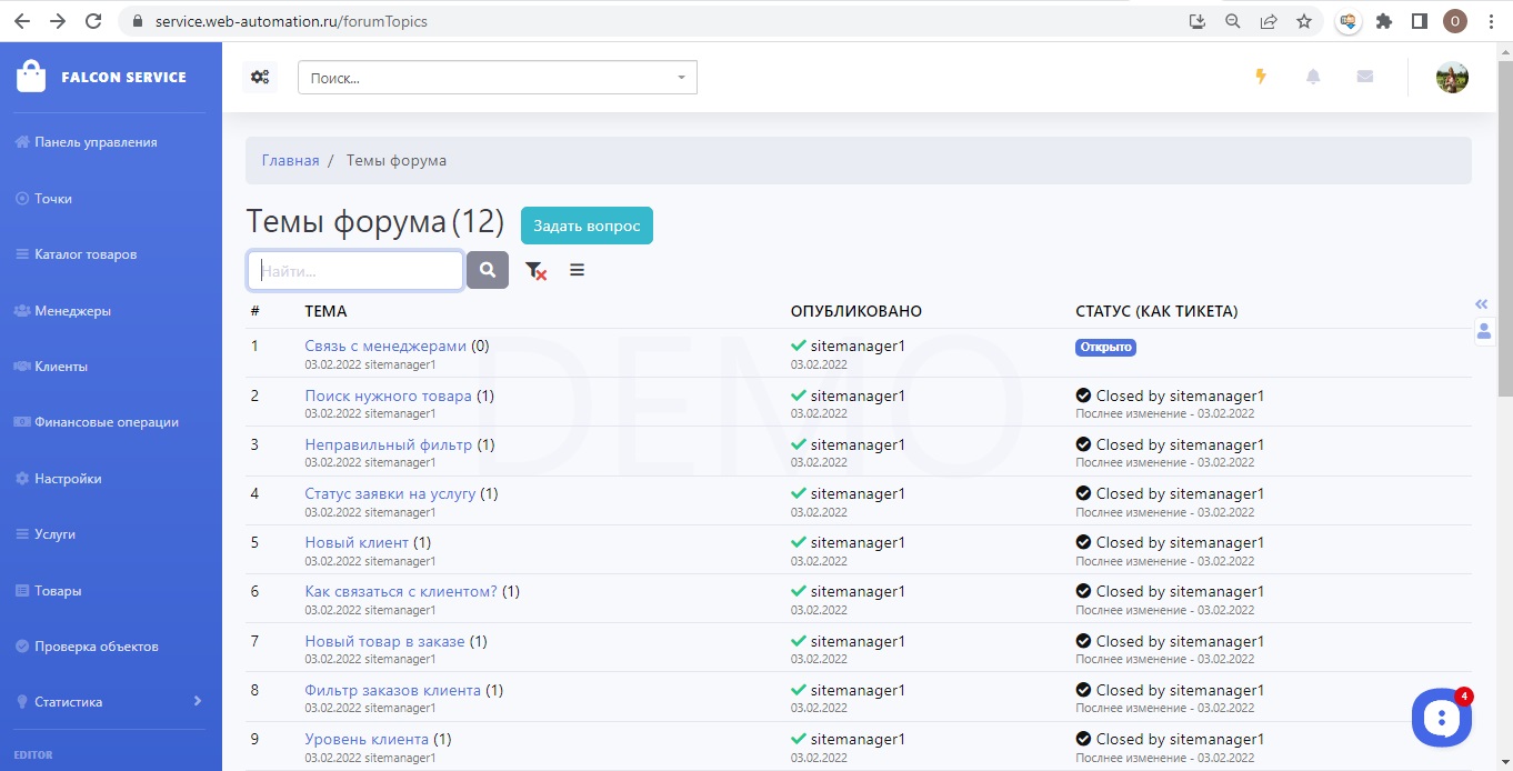 Управление форумом осуществляет супервизор. Только он публикует вопросы, менеджеры точек могут только отвечать на них. Страница Управление форумом находится в левом меню (на синем фоне)