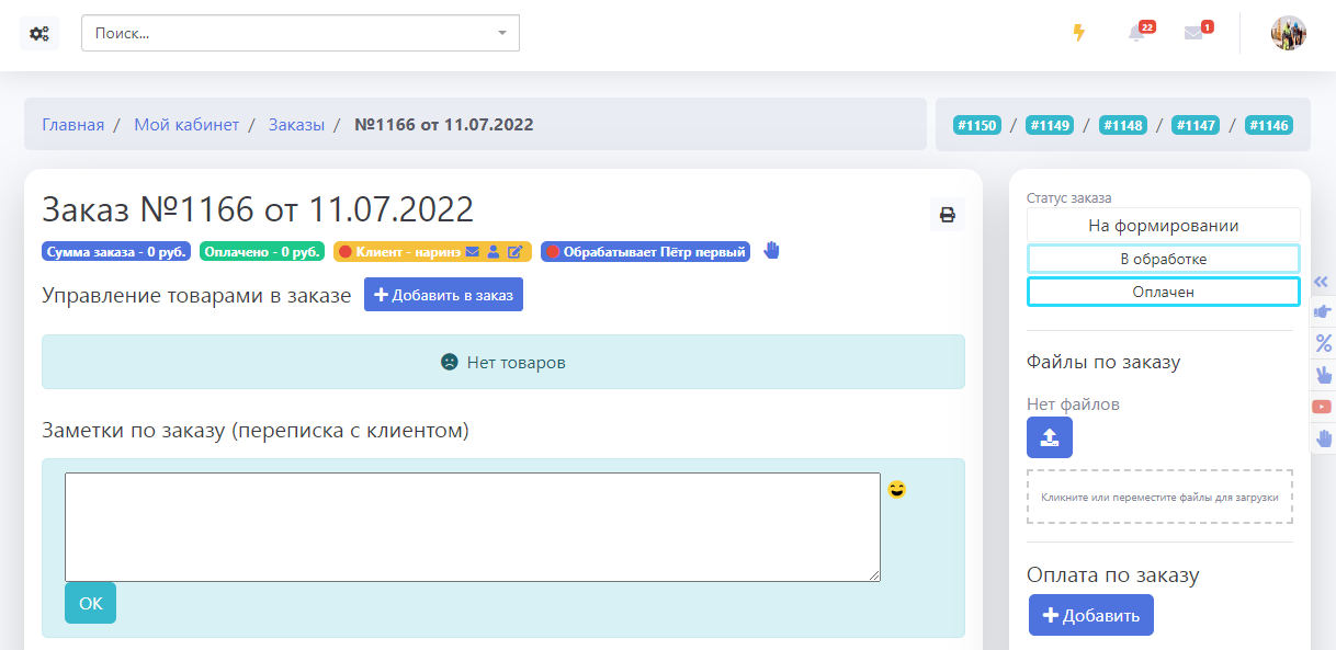 Клиент создает заказ или заявку на услугу. Менеджеры точки получают уведомление и начинают процесс обработки заявки.