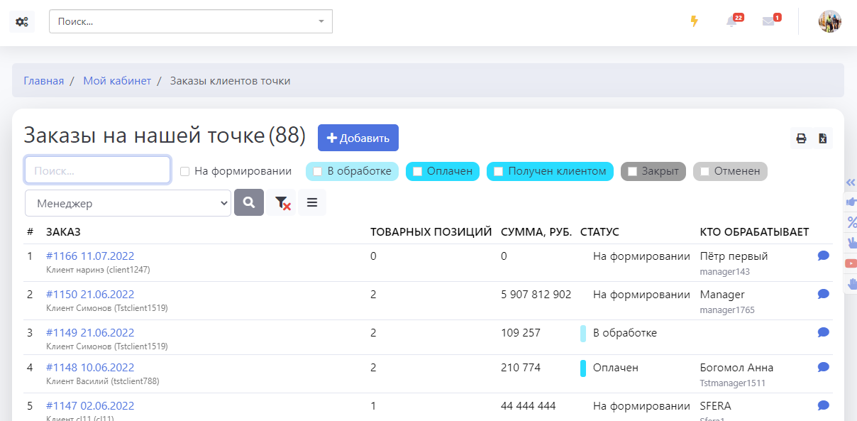 Управление заказами и услугами выполняется на точках менеджерами этих точек.