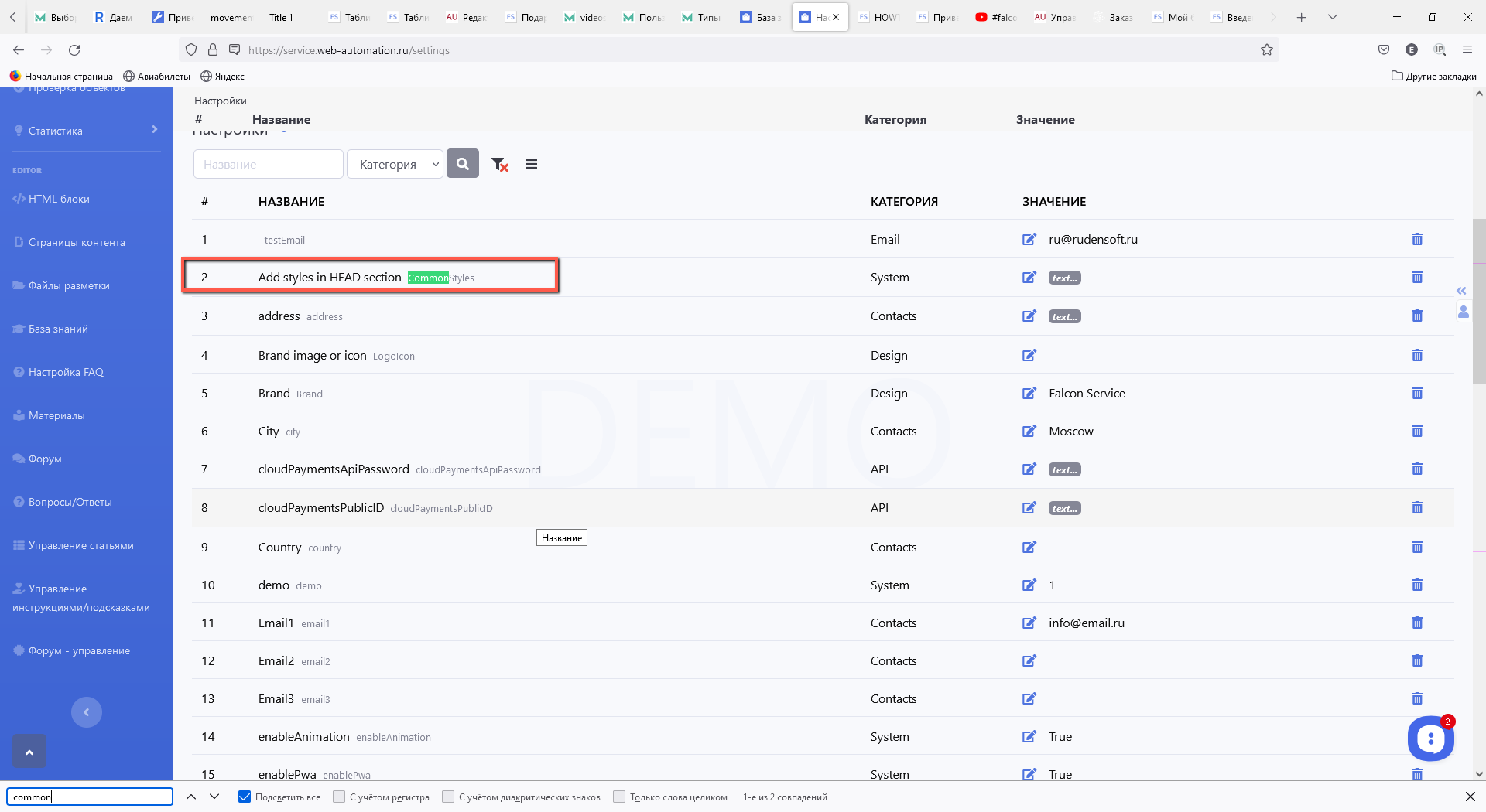 На странице Настройки выбираем настройки CommonScripts, CommonStyles и указываем необходимы значения.