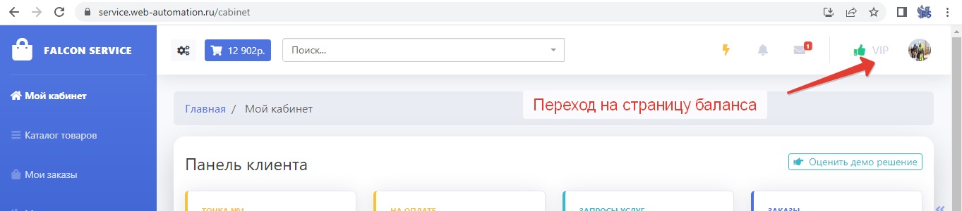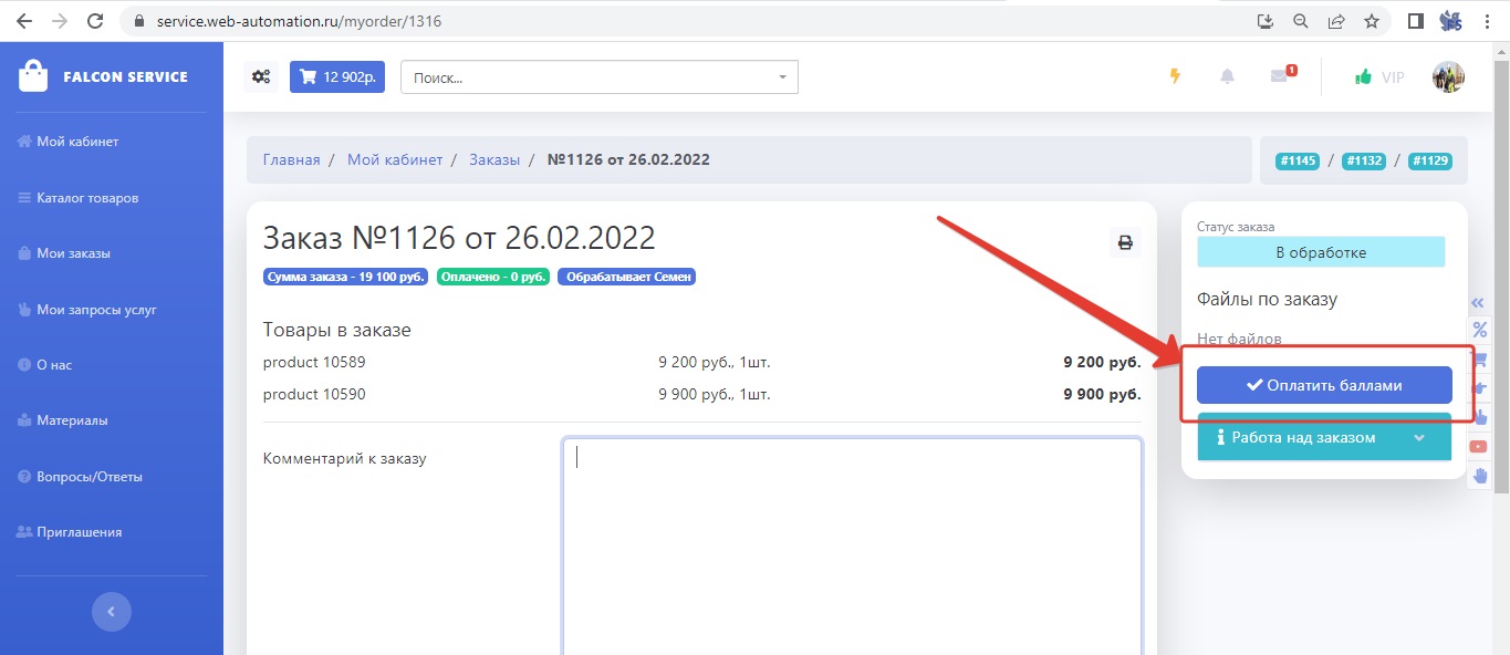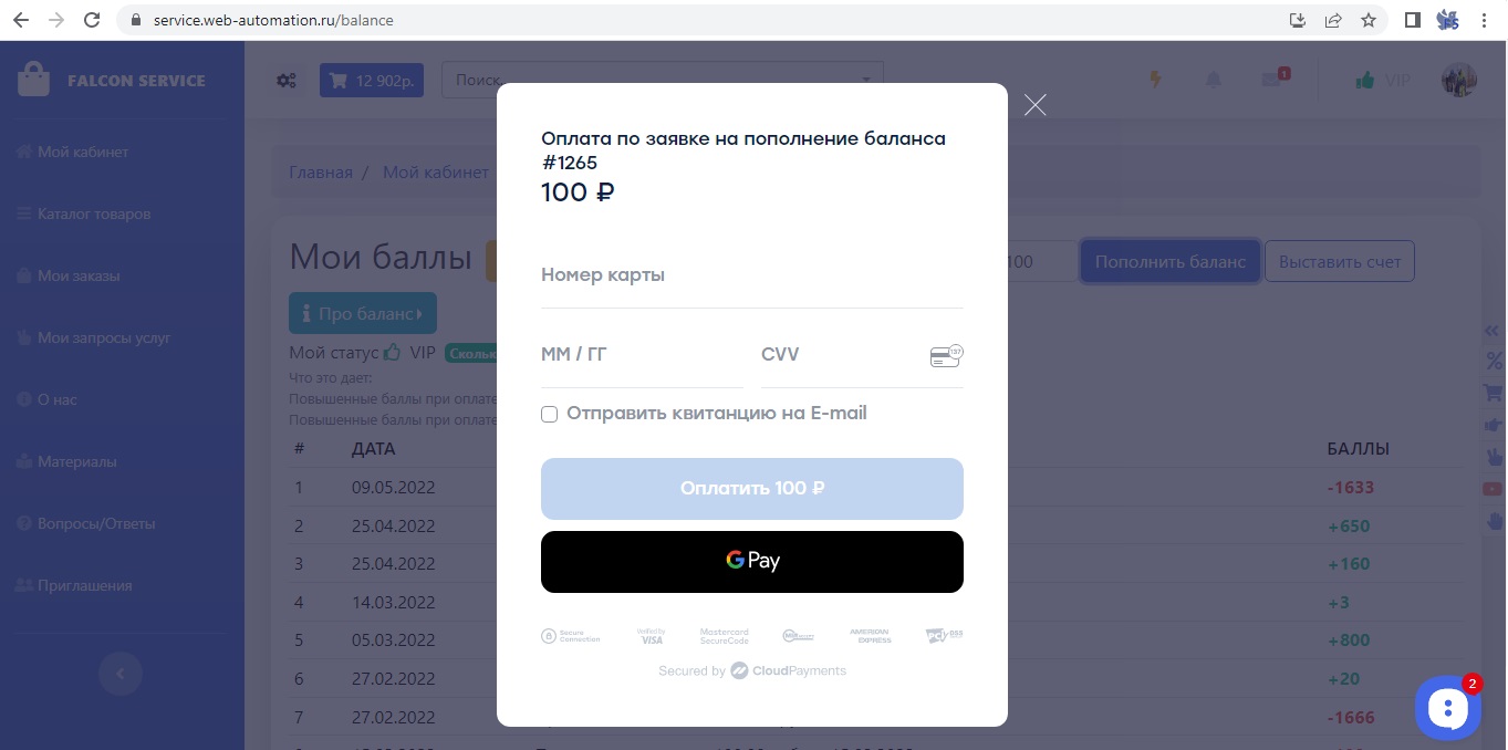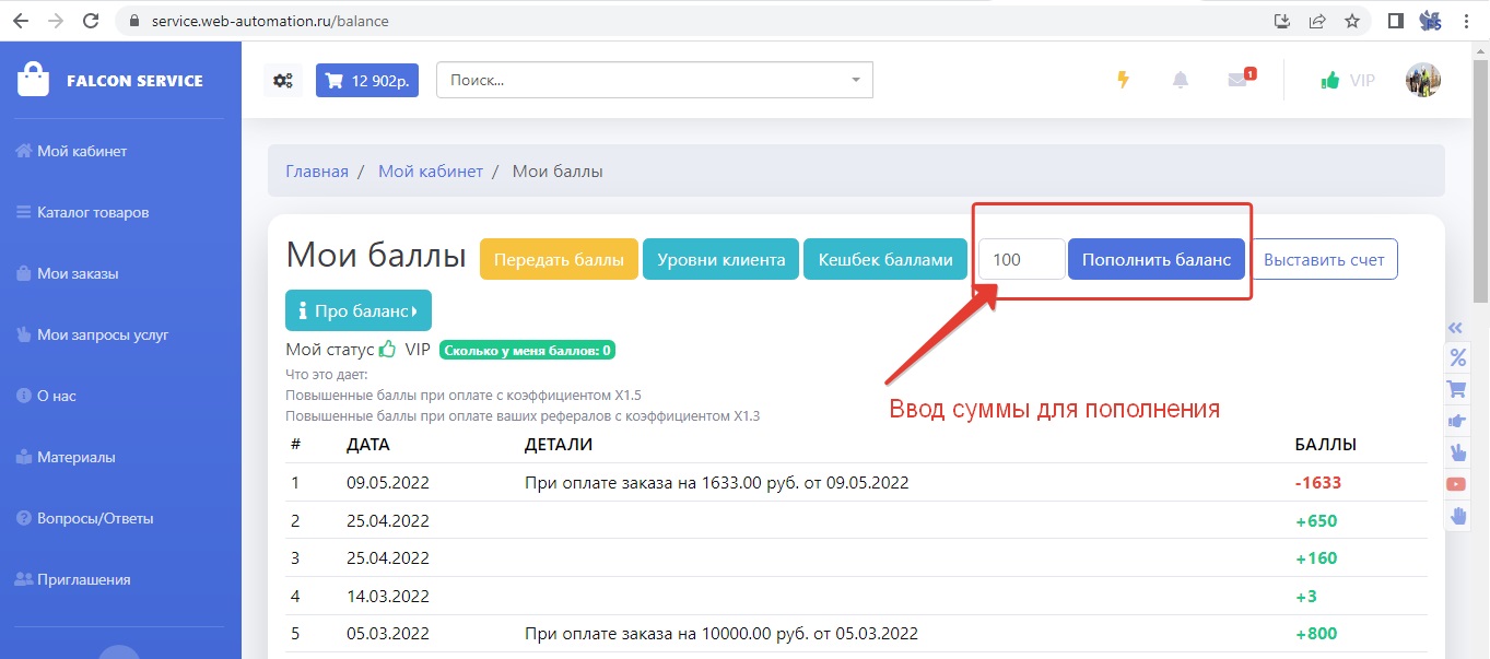 На баланс поступает необходимая сумма. Сумма пополнения в рублях переводится в баллы. На странице заказа можно произвести оплату.