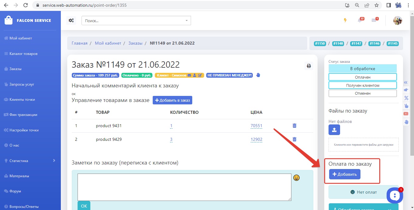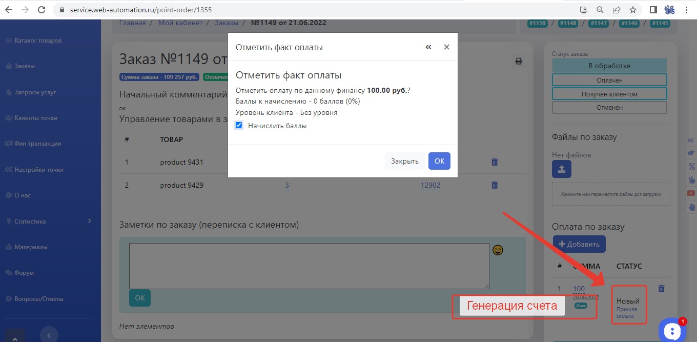 Менеджер точки в своем кабинете через кнопку Добавить вводит сумму нового платежа. В этот момент в системе генерируется новый платеж.