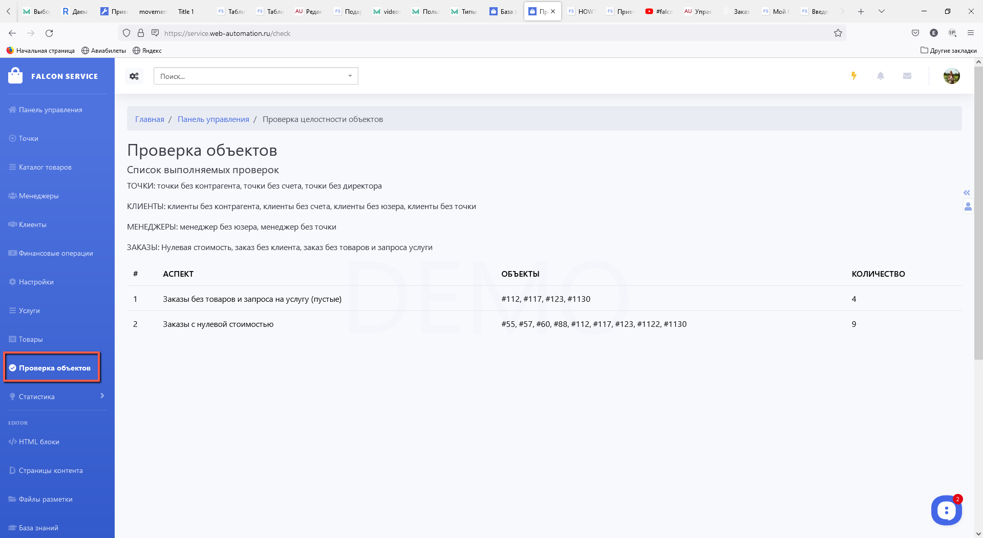 На странице Проверка объектов список таких точек, клиентов, менеджеров, заказов.