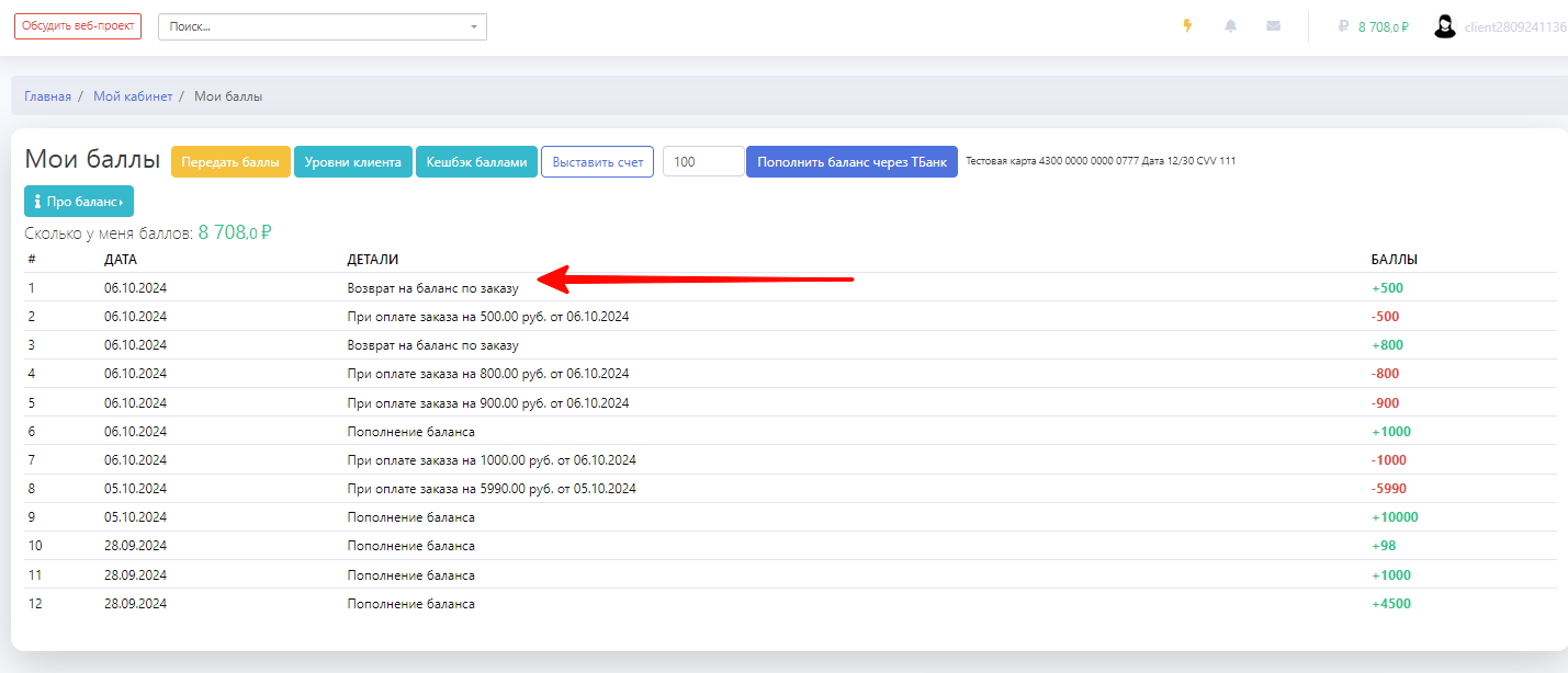 Если клиентом перейти на страницу баланса, то можно увидеть операцию по возврату на баланс: