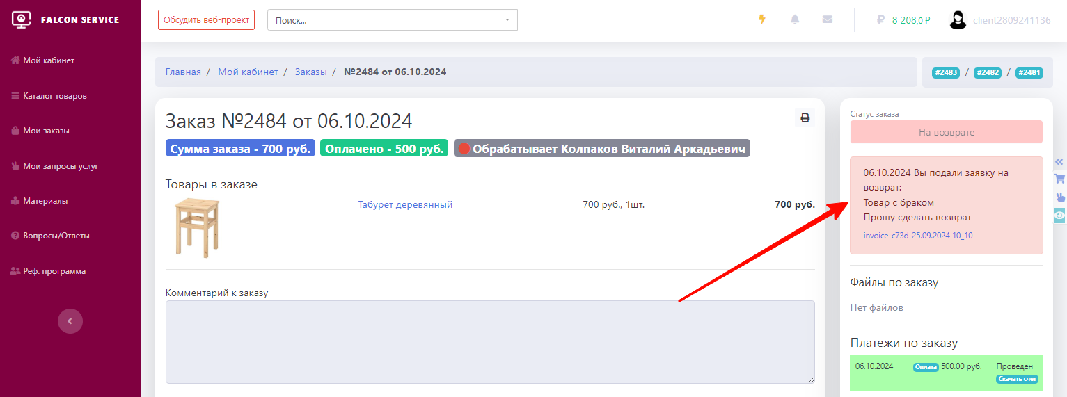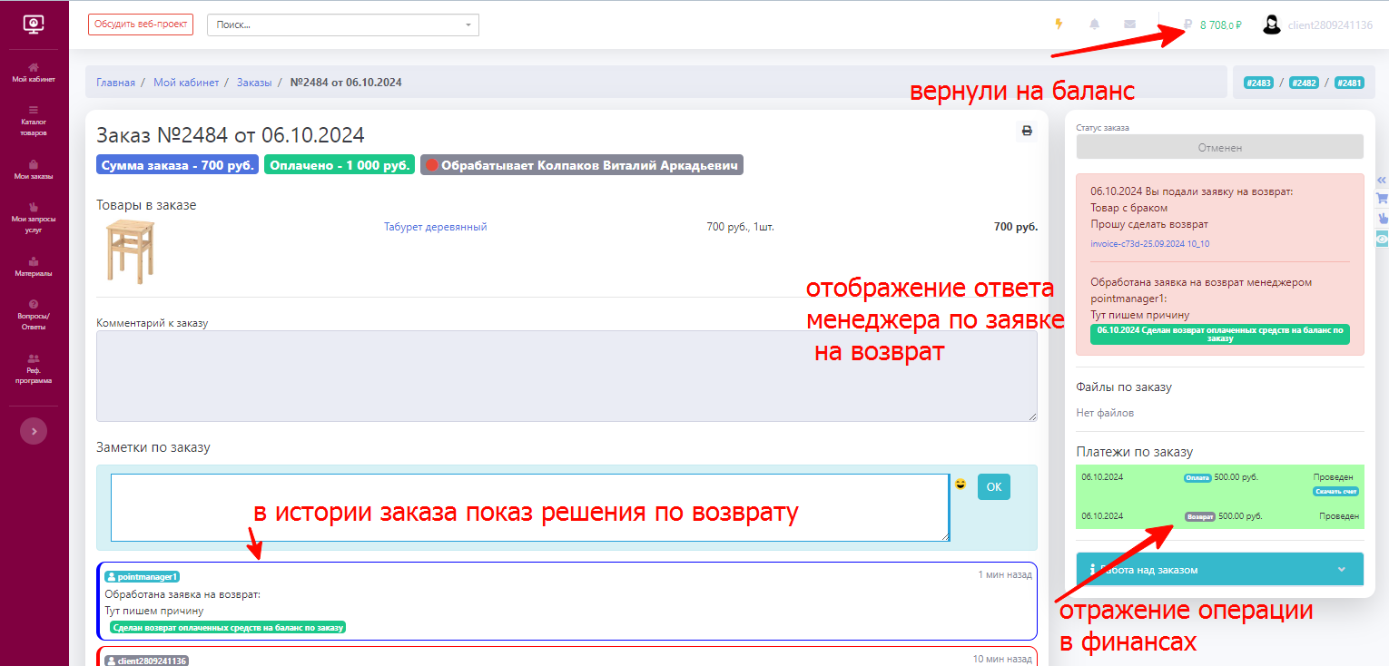 У клиента есть возможность делать заявки на возврат средств по заказу.