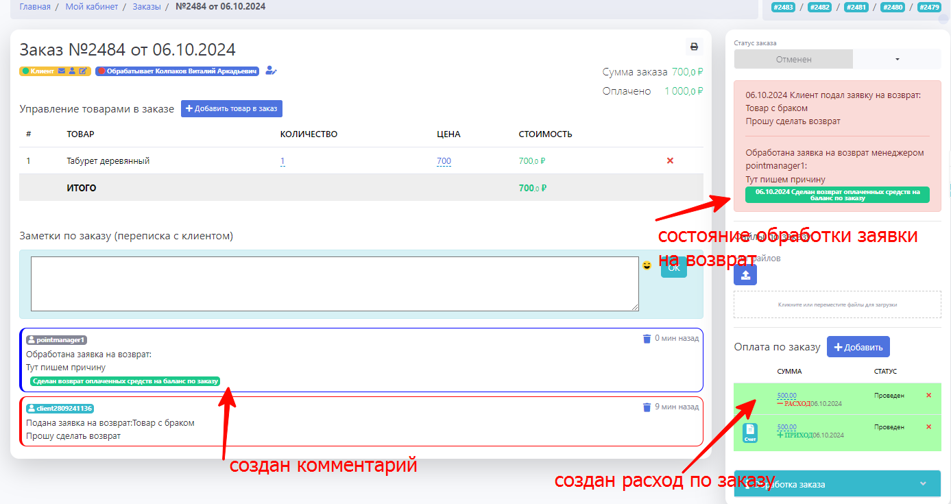 При нажатии на кнопку формы заказ переведется в статус Отменен, будет добавлен комментарий в заказ и идет уведомление клиенту, что менеджер обработал заявку на возврат.