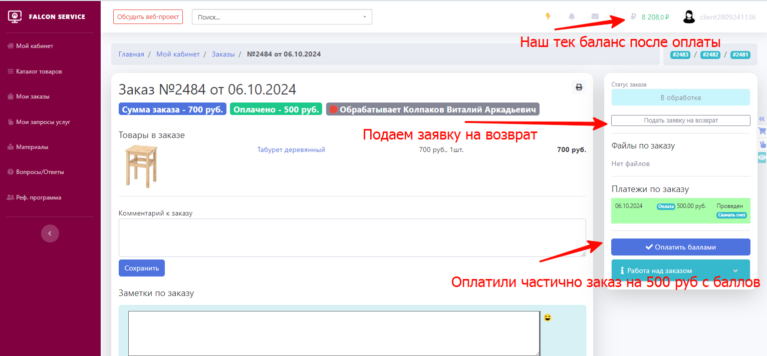 1. Клиент делает заказ и оплачивает его полностью или частично баллами.