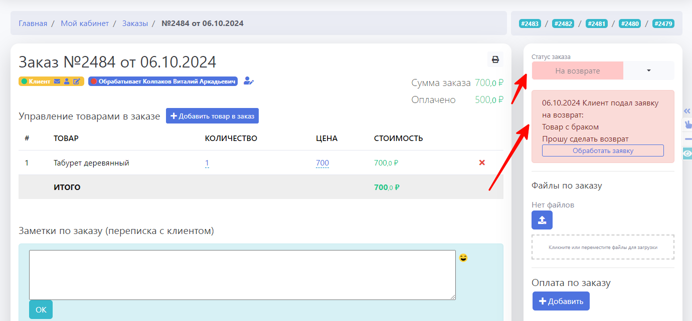 На форме видим исходные данные заявки (комментарий клиента + файлы), а также сумму фактической оплаты по заказу (в примере заказ был на 700 руб, а оплатил клиент с баланса 500 руб.).