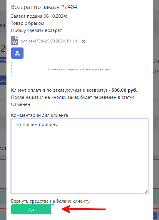 В форме клиент указывает комментарий и может прикрепить файлы (например, фото брака).
