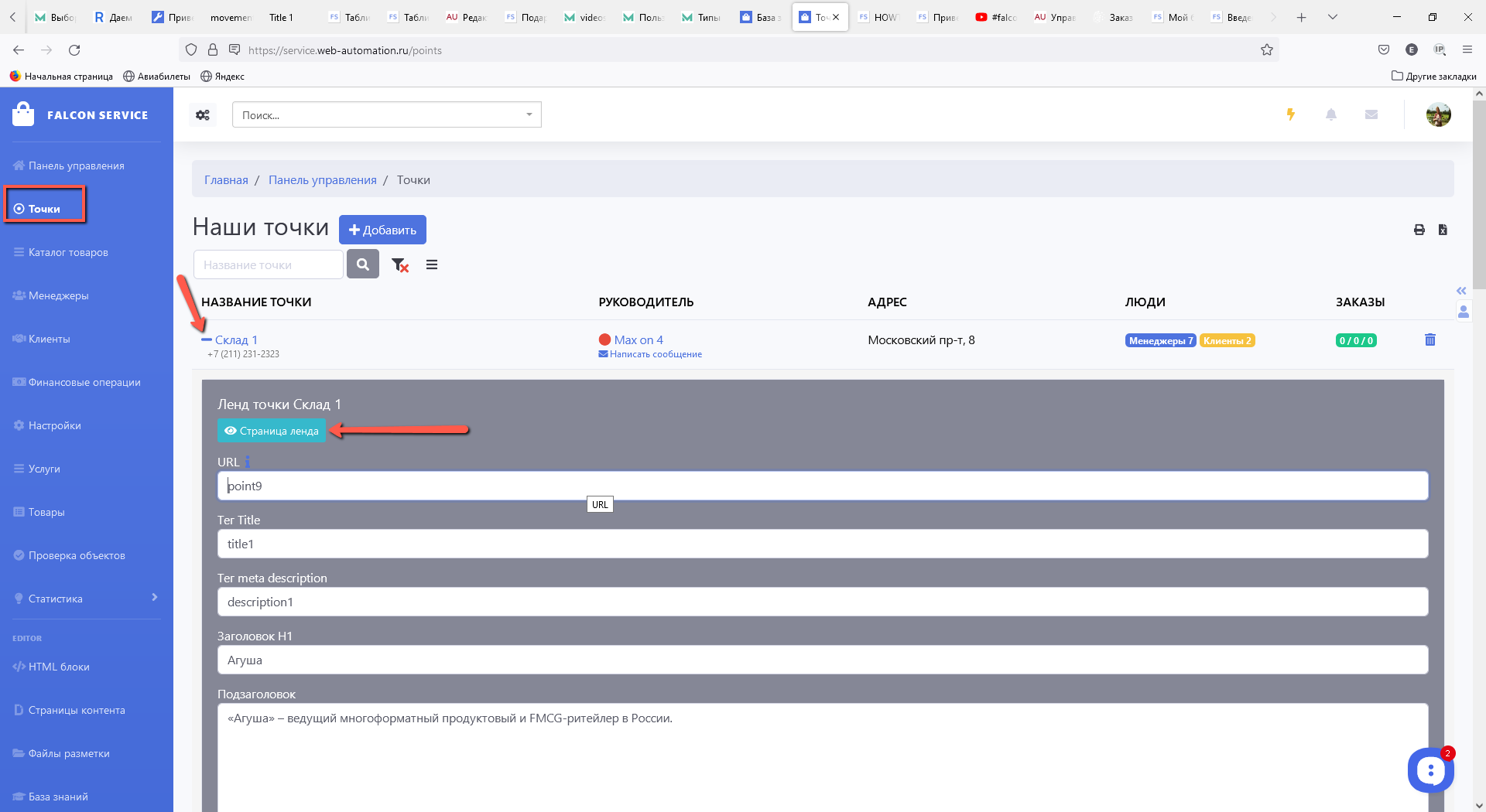 На форме радактирования можно указать заголовки, url, мета-теги, поисание и загрузить изображение. Ленд будет доступен по адресу /p/{landCode}.