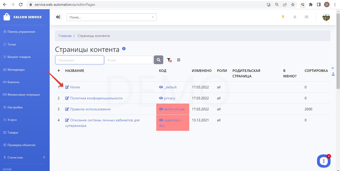 На странице Страницы контента есть спсиок статичных страниц. Иконка для перехода на форму редактирования находится рядом с названием.