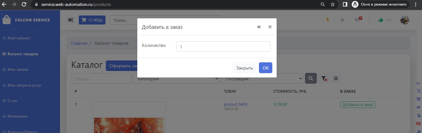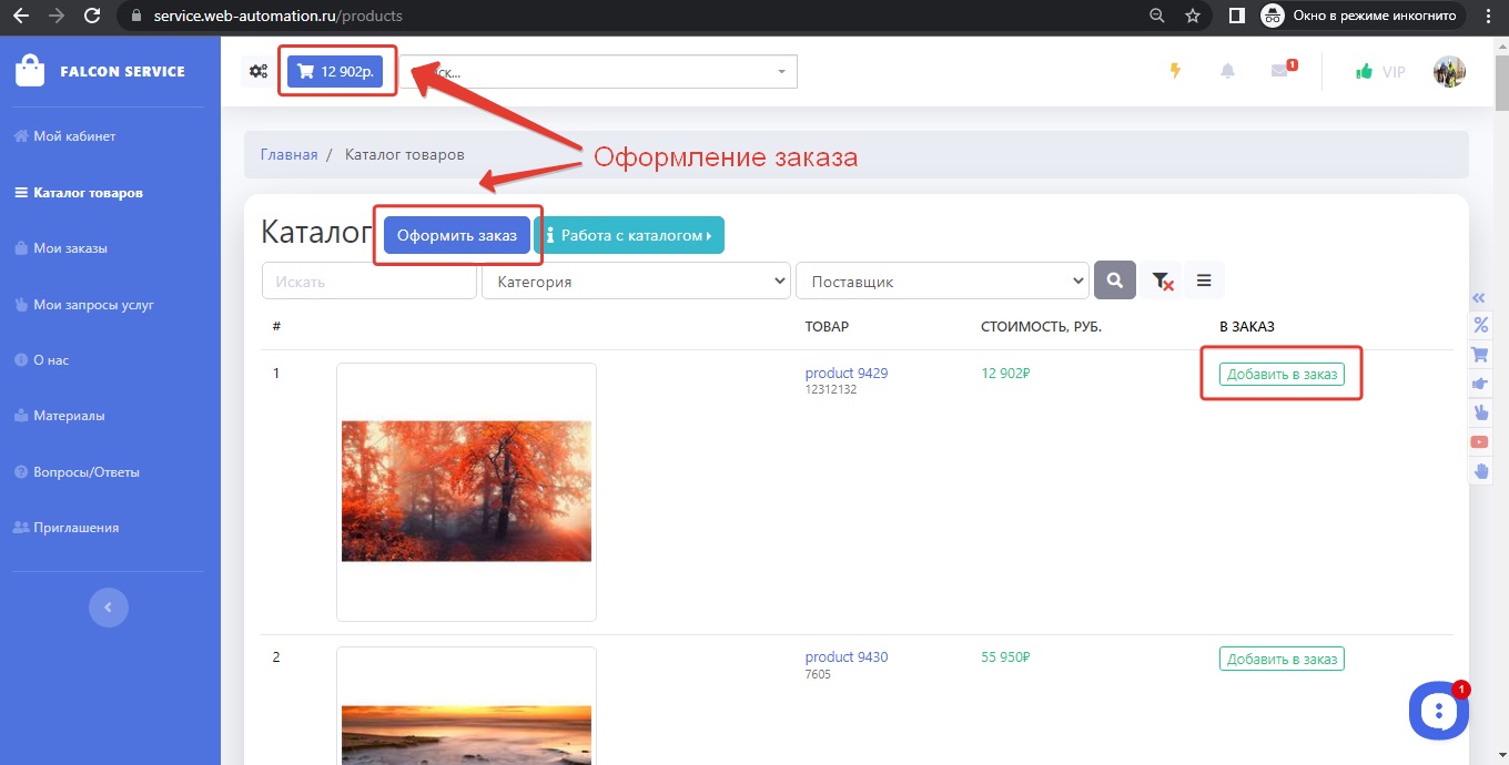 Клиент оформляет заказ в своем кабинете. Для этого он должен перейти на страницу Каталог товаров. Напротив каждого товара стоит кнопка Добавить в заказ. Клиент выбирает необходимы товары и указывает количество.