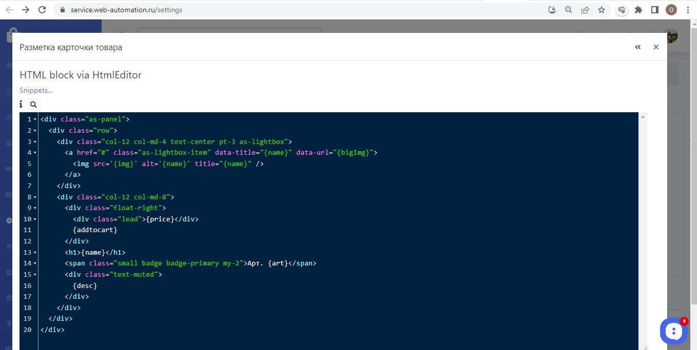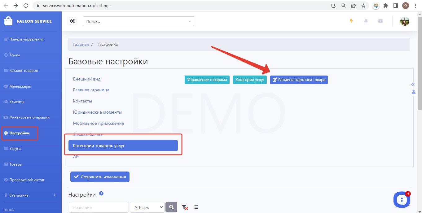Форма с разметкой карточки товара находится на странице Настройки в разделе Категории товаров, услуг. Для редактирования необходимо знать html.
