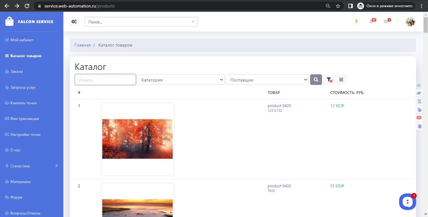 Каталог товаров представлен таблицей товаров с фильтрами. Посмотреть его можно в кабинете клиента или менеджера.