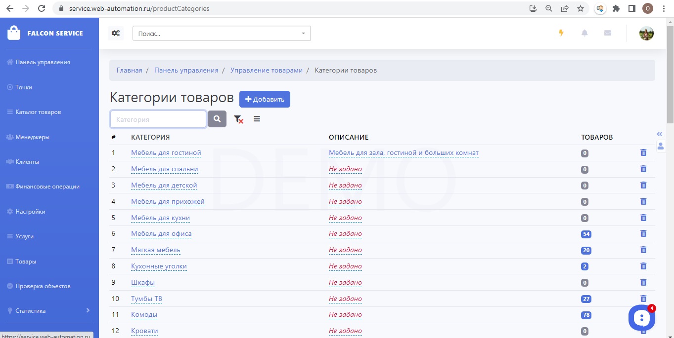 Чтобы добавить единицу товара нажимаем кнопку добавить и вводим название. После этого товар появляется в списке и можно реактировать артикул, стоимость, выбрать категорию и загрузить изображение.