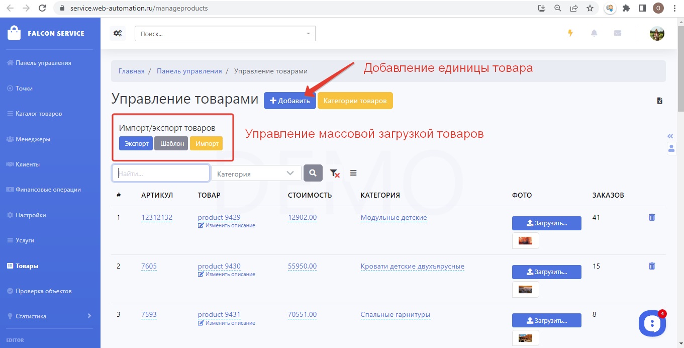 Чтобы загрузить товары массово необходимо скачать шаблон (таблица Excel), заполнить ее и загрузить через кнопку импорт.