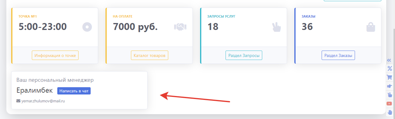 В кабинете клиента на дашборде персональный менеджер будет выводиться внизу панели: