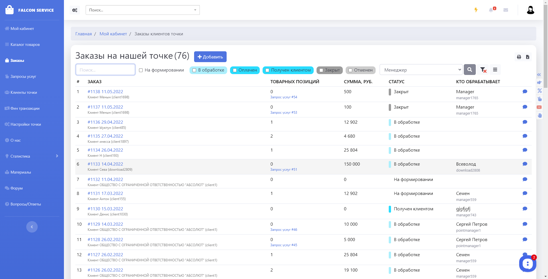 Менеджер в своем кабинете обрабатывает заказы только своей точки (и видит клиентов только своей точки).