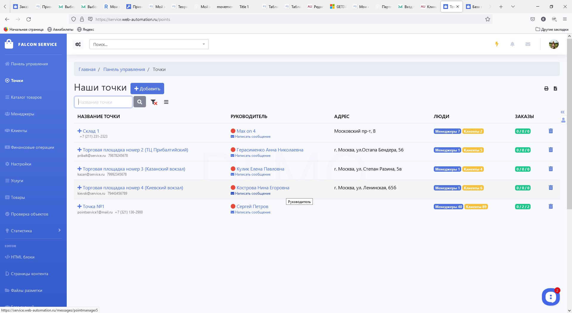 Точки, менеджеры, клиенты