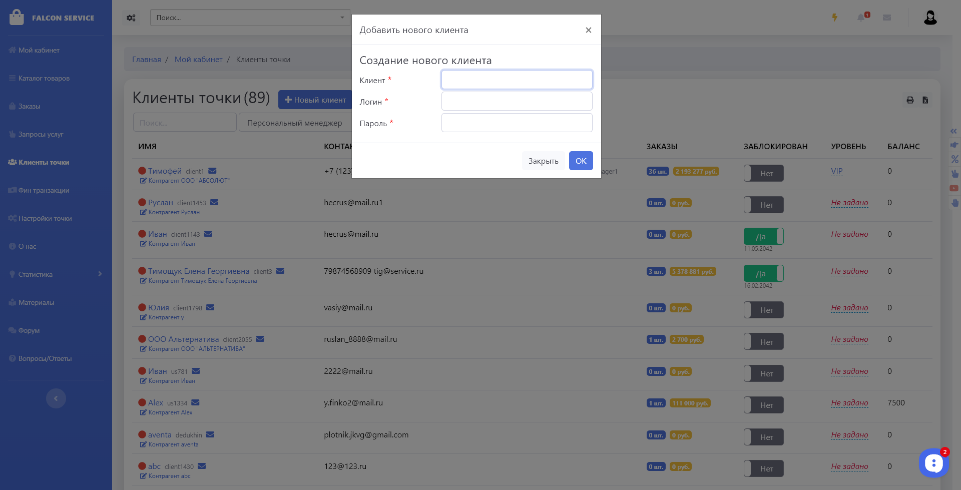 На точках работают менеджеры и клиенты. Клиент в своем кабинете видит информацию только по своей точке.
