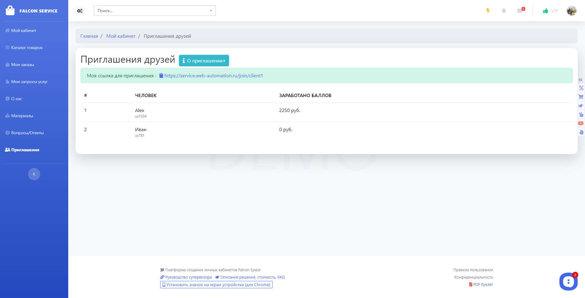 В системе клиент видит всех клиентов, зарегистрированных по его ссылке, а также видит сумму полученных баллов по ним.