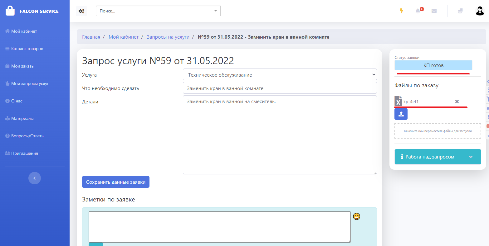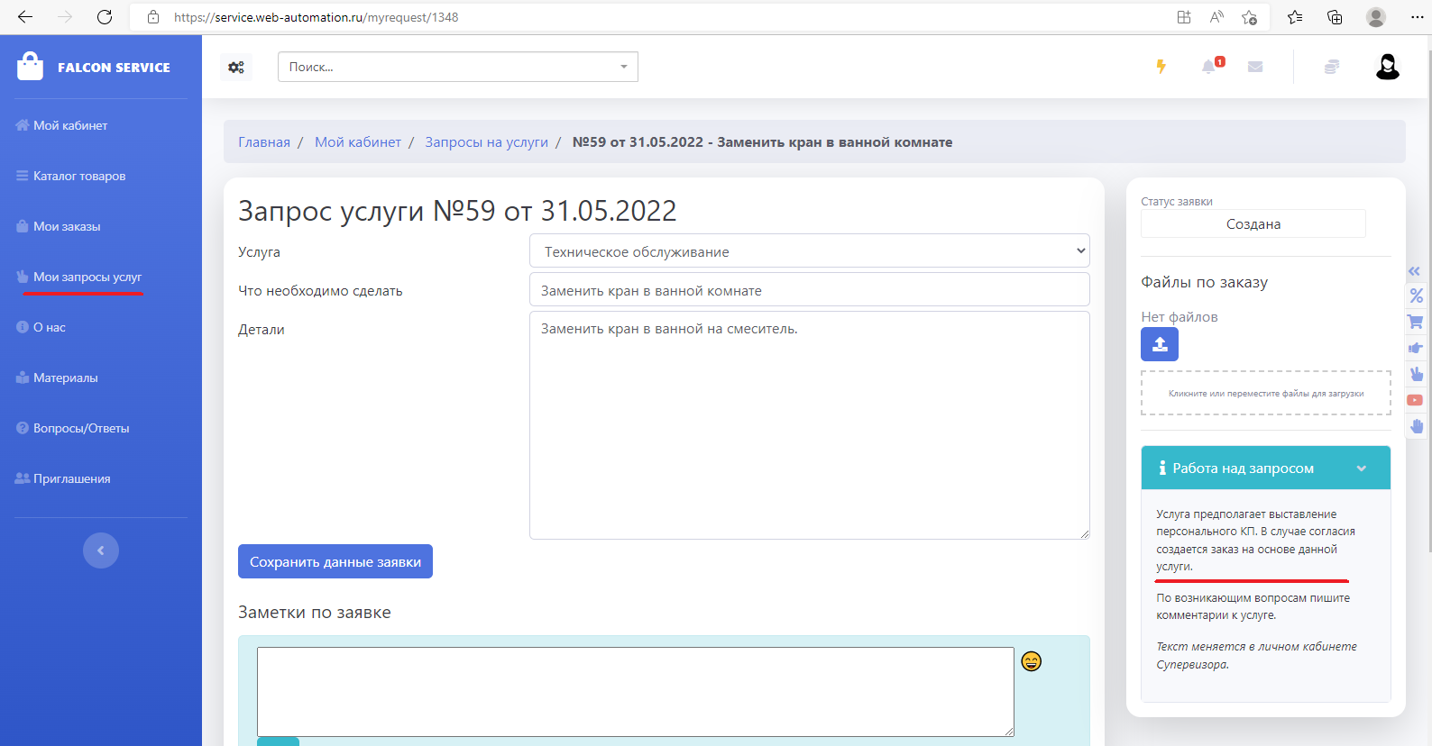 После того как клиент, в своем личном кабинете, создал запрос на услугу: