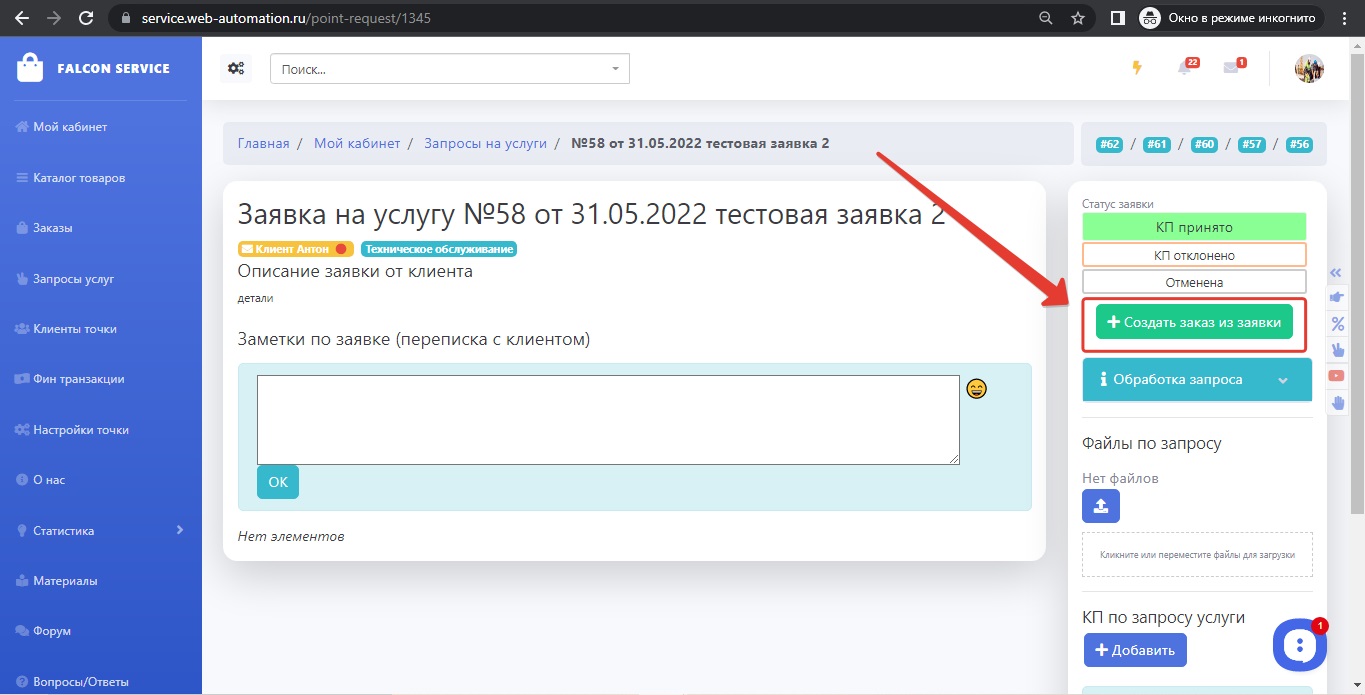 После того как у заявки появился статус КП Принято появляется кнопка Создать заказ.