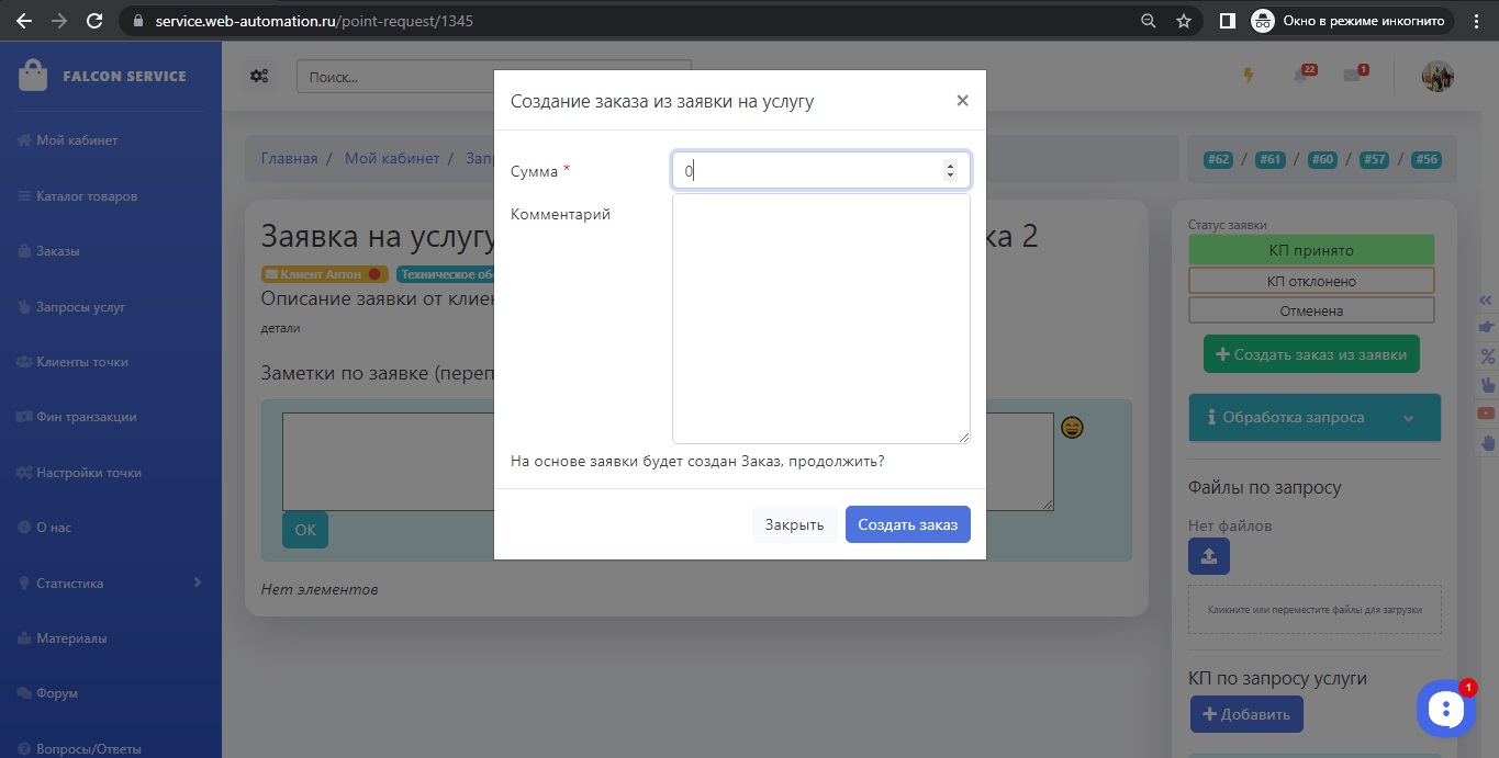 Заявка попадает на рассмотрение менеджеру точки, который готовит коммерческое предложение (КП) и согласовывает его с клиентом. К КП можно прикрепить дополнительный файл. Для фиксирования обсуждений/итории изменения заказов можно воспользоваться заметками по заявке. По мере обработки заявки меняет и статусы заявки: