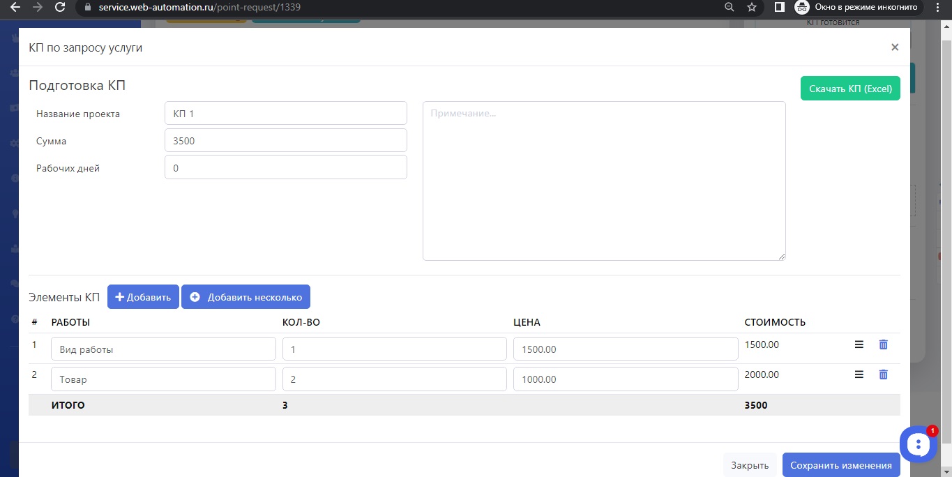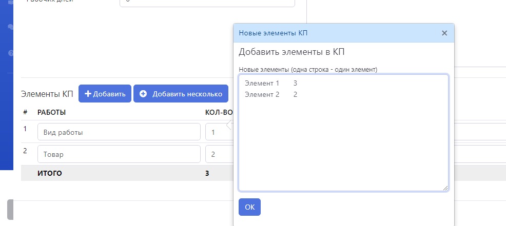 В форме КП указываем сумму, сроки и примечание при необходимости. Элементы КП можно добавить по одной строки, можно сразу несколькими. Вводим название, после появления элемента можно отредактировать стоимость и количество. Сумму система посчитает автоматически.