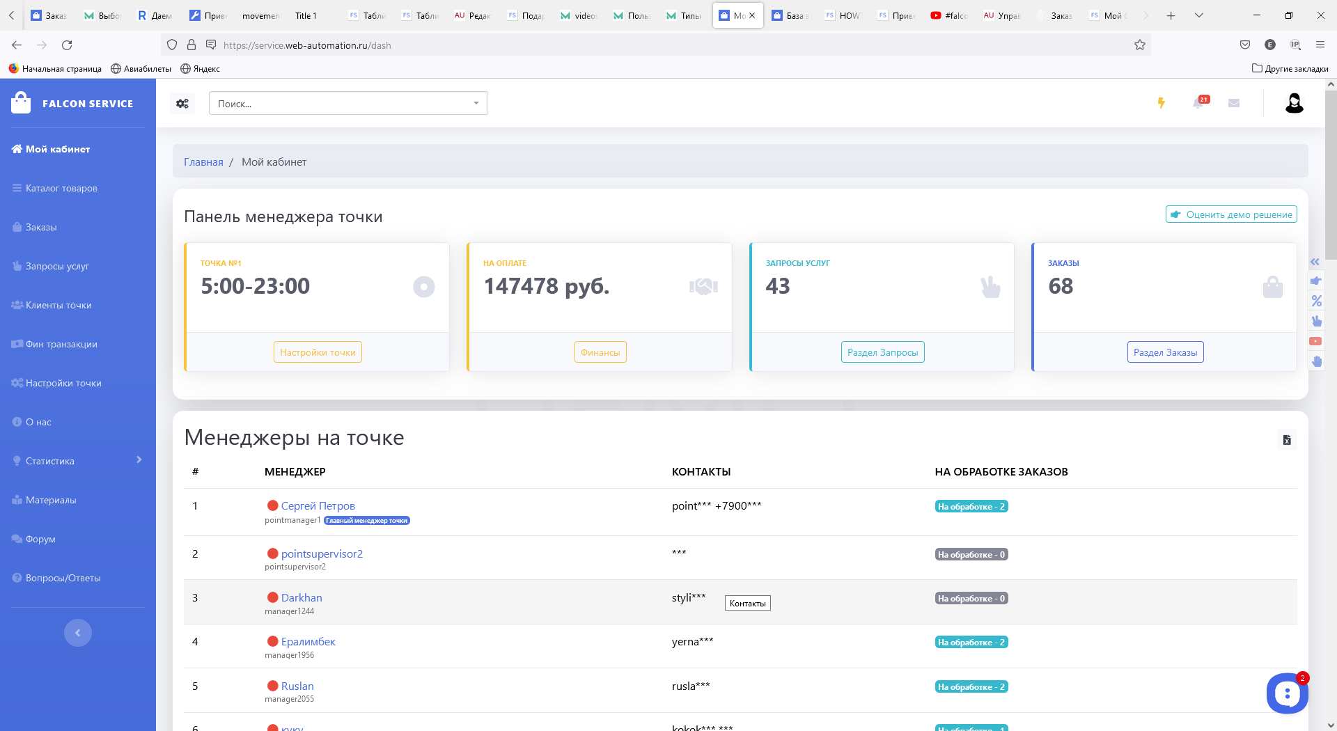 Обработка заказов и запросов услуг от клиентов, ведение переписки с клиентом, просмотр клиентов точки, также добавление новых клиентов, а также блокировка существующих клиентов. Управление финансовыми операциями на точке. Просмотр статистики по заказам, по клиентам, статистика точки, по услугам.