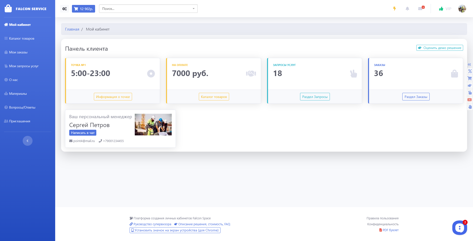 Позволяет клиенту просматривать каталог товаров, создавать заказы, создавать заявки на услуги, отслеживать статус заказа и заявки. Также получать уведомления от администрации площадки. Приглашать друзей в систему (рефералы).