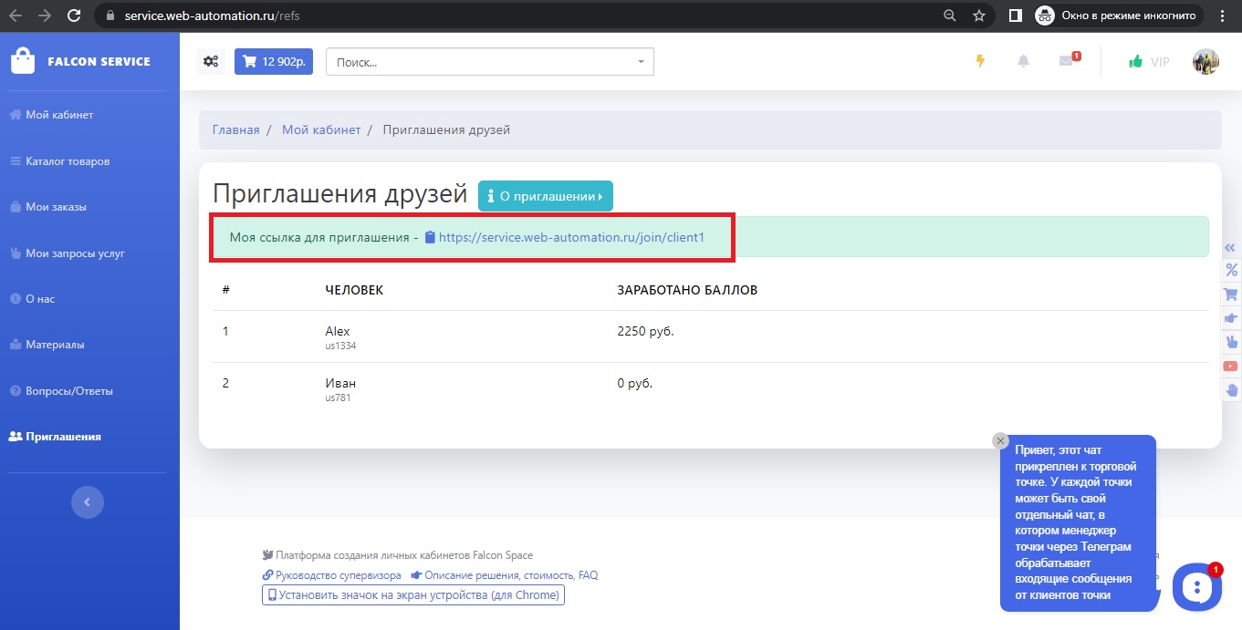 В кабинете клиента есть страница Приглашения, на которой указана персональная ссылка
